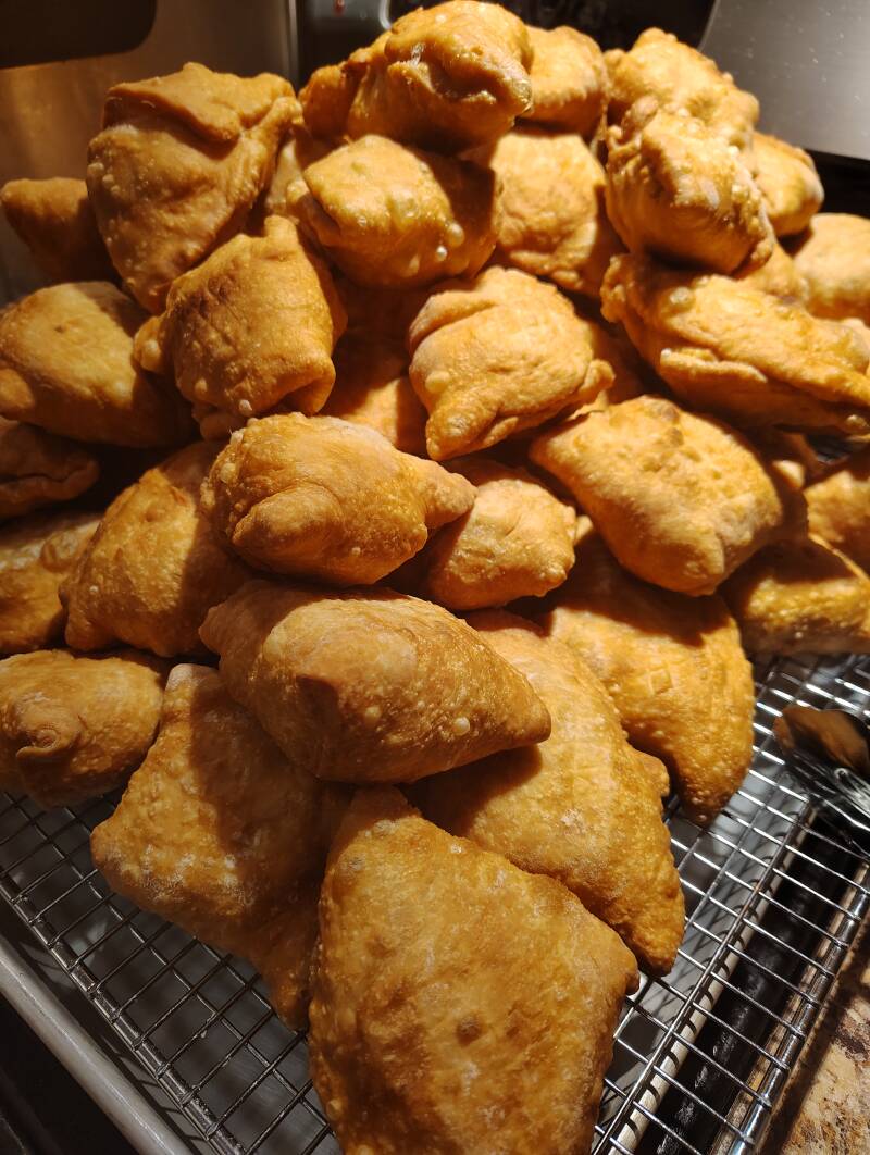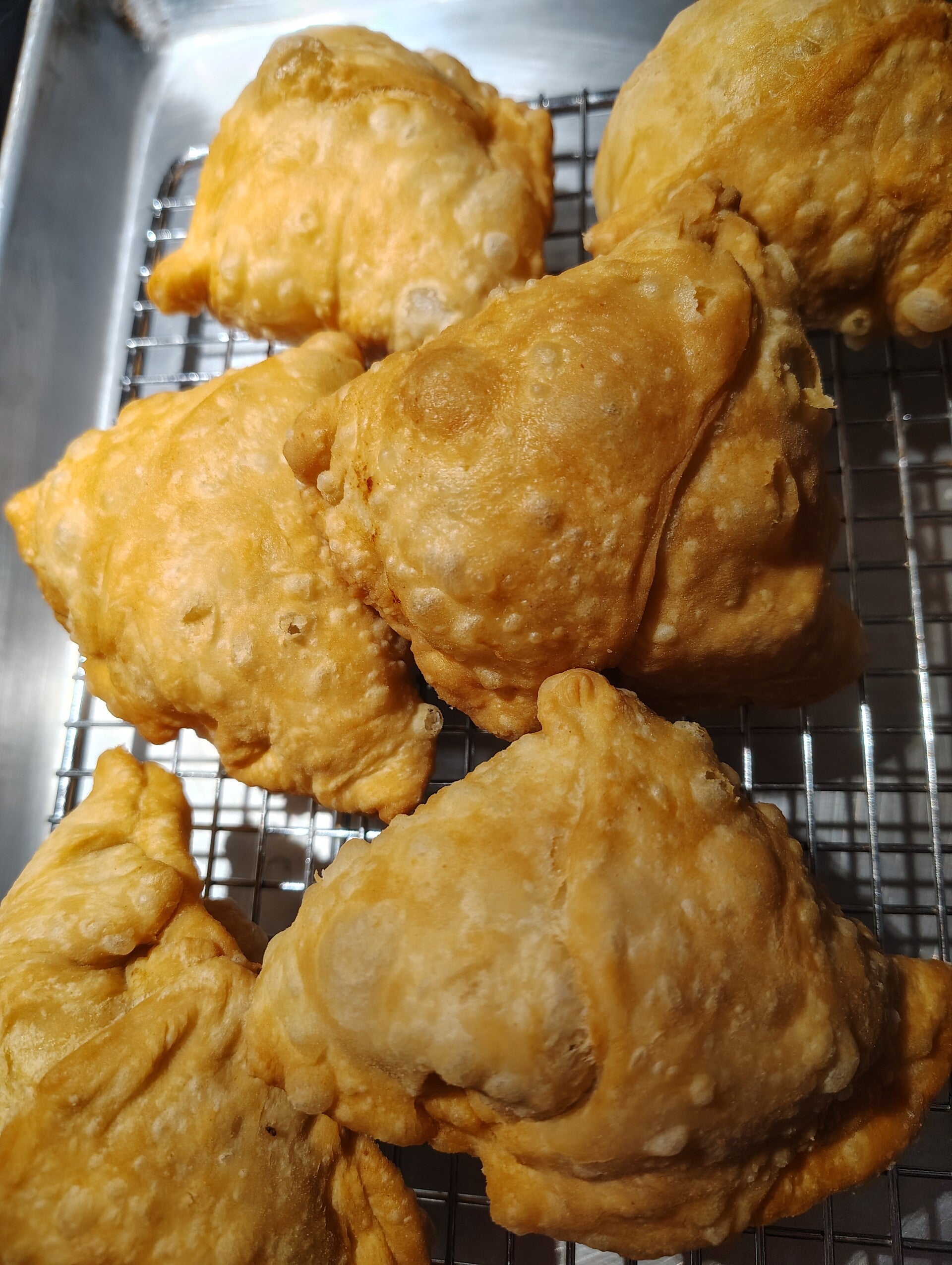 Cut each circle in half to form two semi-circles. Brush the straight edges lightly with milk. Add one portion of filling, then fold and overlap the corners to form a triangle, sealing the seams well so they don’t open during frying.